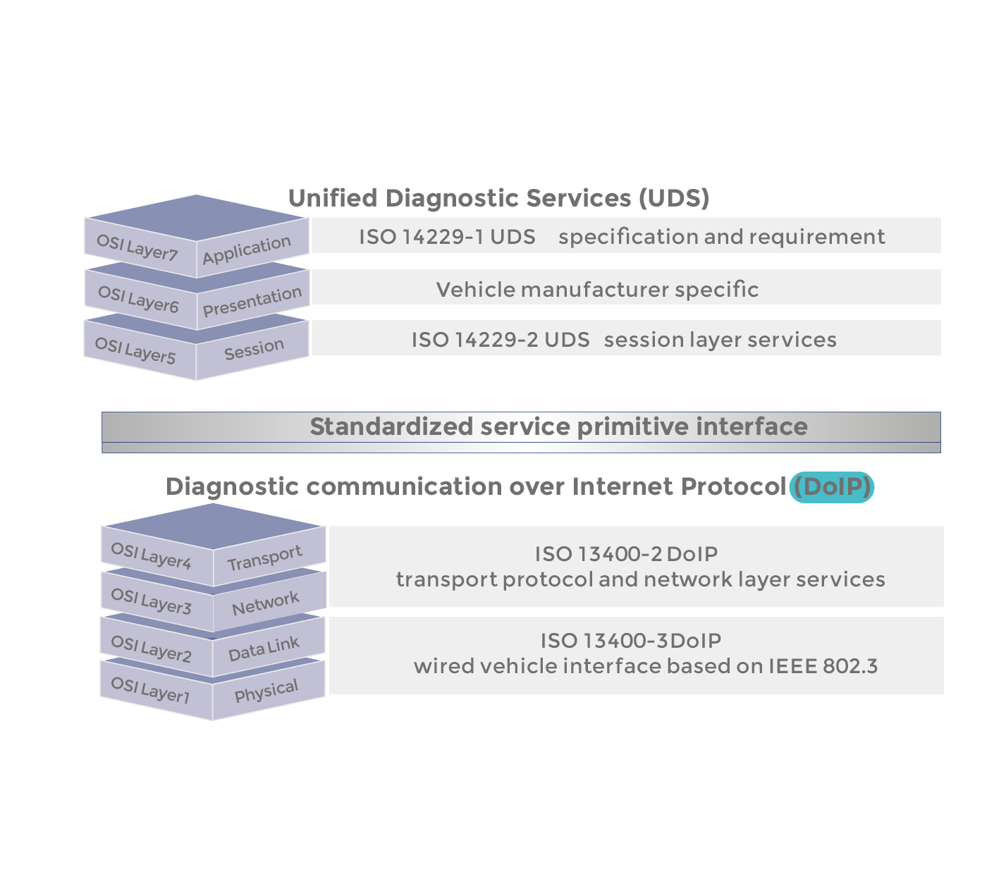 DoIP协议栈遵循ISO 13400规范,主要用于实现基于以太网通信的诊断功能。协议栈参考OSI七层网络模型进行设计,网络层和传输层基于TCP/IP的DoIP协议。用户基于对应的SDK包,可以在相应的控制器上实现以太网通信诊断,如车辆发现、路由激活、在线检测、连接维护、DoIP实体状态获取、诊断电源模式获取、诊断应用等功能。
